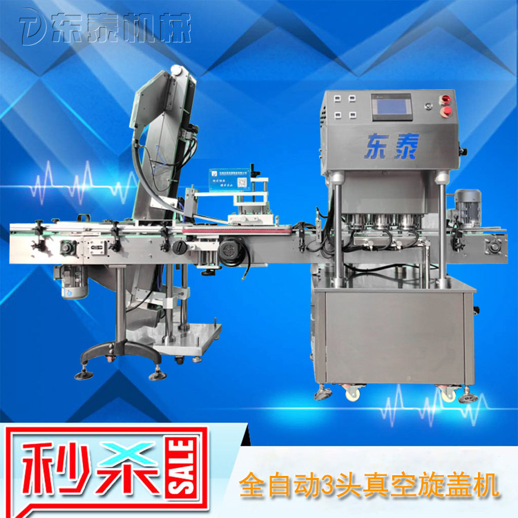 該直線式真空旋蓋機(jī)是東泰機(jī)械結(jié)合用戶使用的情況,摒棄了傳統(tǒng)轉(zhuǎn)盤式真空旋蓋機(jī)的弊端,研制開發(fā)的新型高效設(shè)備,設(shè)備自動(dòng)檢測(cè)到兩個(gè)瓶子蓋子進(jìn)入到雙頭真空旋蓋機(jī)內(nèi),旋蓋機(jī)彩色顯示屏?xí)?shí)時(shí)顯現(xiàn)旋蓋狀況,整機(jī)多點(diǎn)檢測(cè),當(dāng)進(jìn)口無(wú)瓶無(wú)蓋、出口堵塞、定位不準(zhǔn)、瓶身傾倒均自動(dòng)停機(jī)。單個(gè)旋蓋頭達(dá)到的真空度都可以單顯示,單調(diào)整