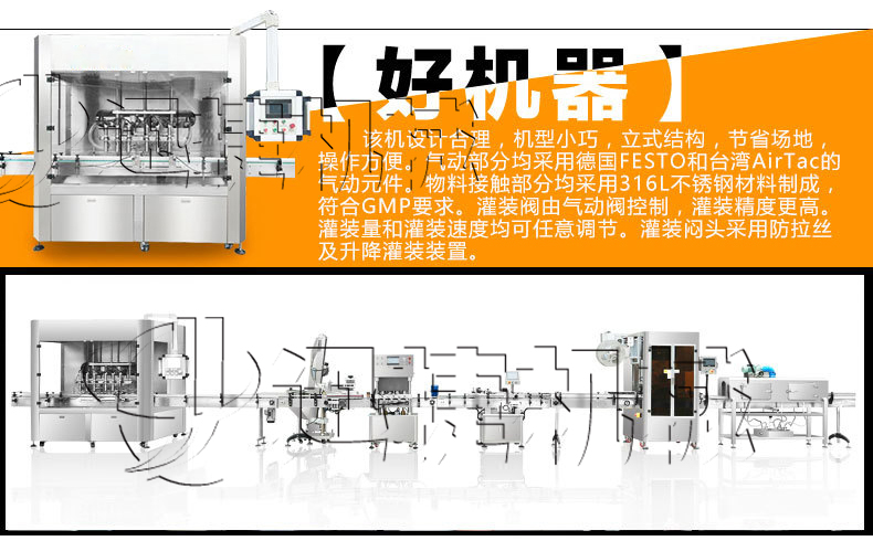 4、人機界面與PLC通訊,調(diào)試設備或更換品種只需在屏幕上設定。進瓶、定位、灌裝充填、出瓶均自動作業(yè)。