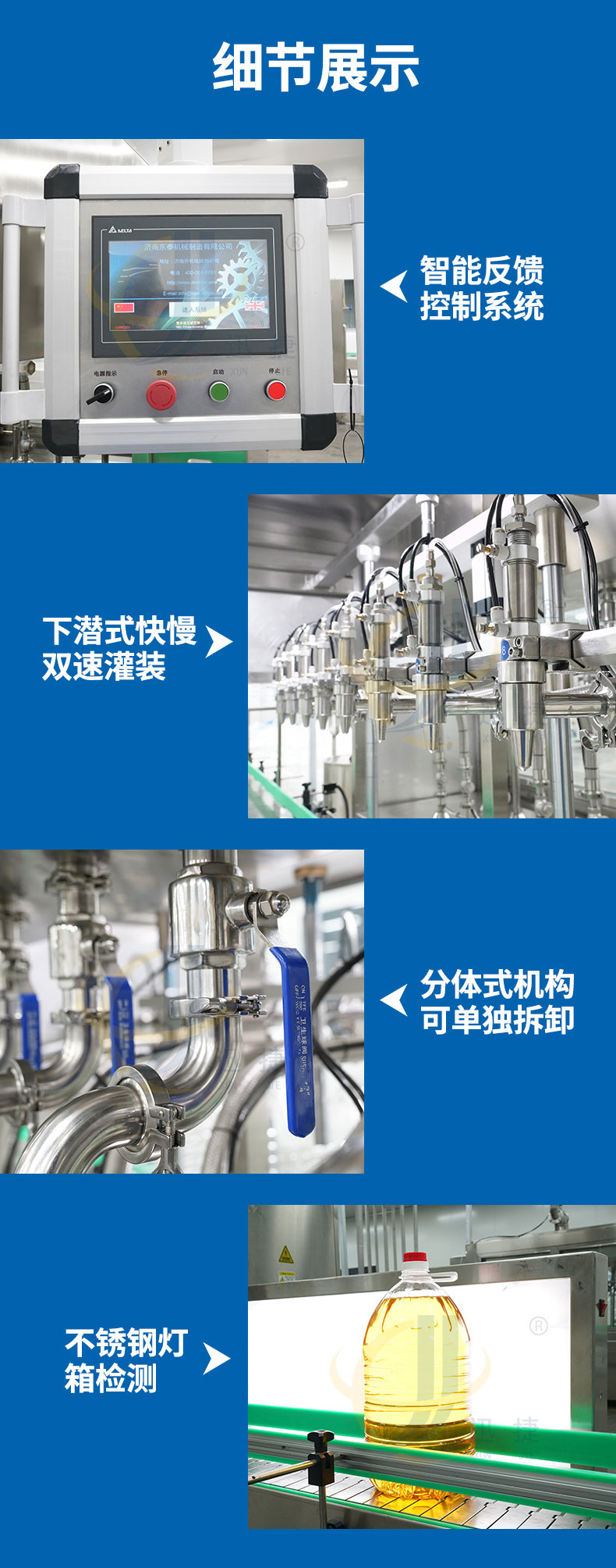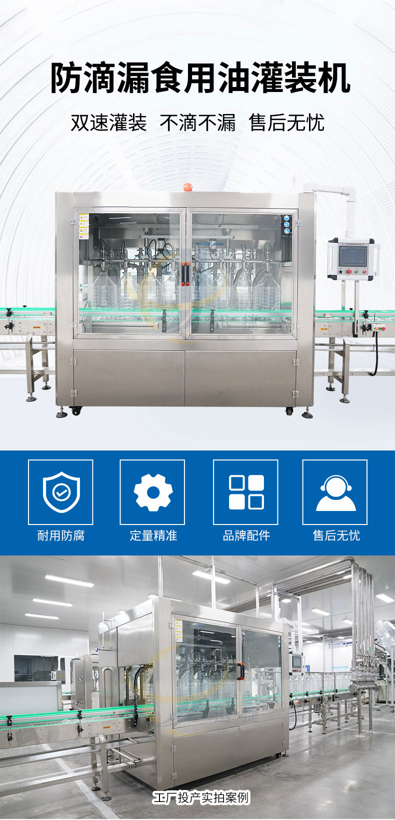 全自動(dòng)八頭食用油灌裝機(jī)單頭單泵單變頻控制,容積和質(zhì)量兩種計(jì)量方式自由轉(zhuǎn)換,灌裝調(diào)節(jié)方便快捷。