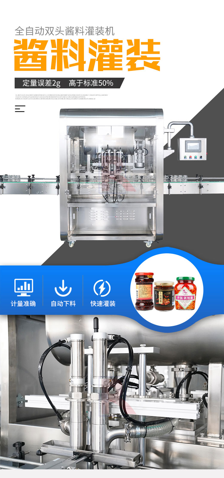 雙頭醬料灌裝機適用于調味品中帶顆粒并且濃度較大的香菇醬、豆瓣醬、花生醬、芝麻醬、果醬、牛油火鍋底料等醬類的灌裝。