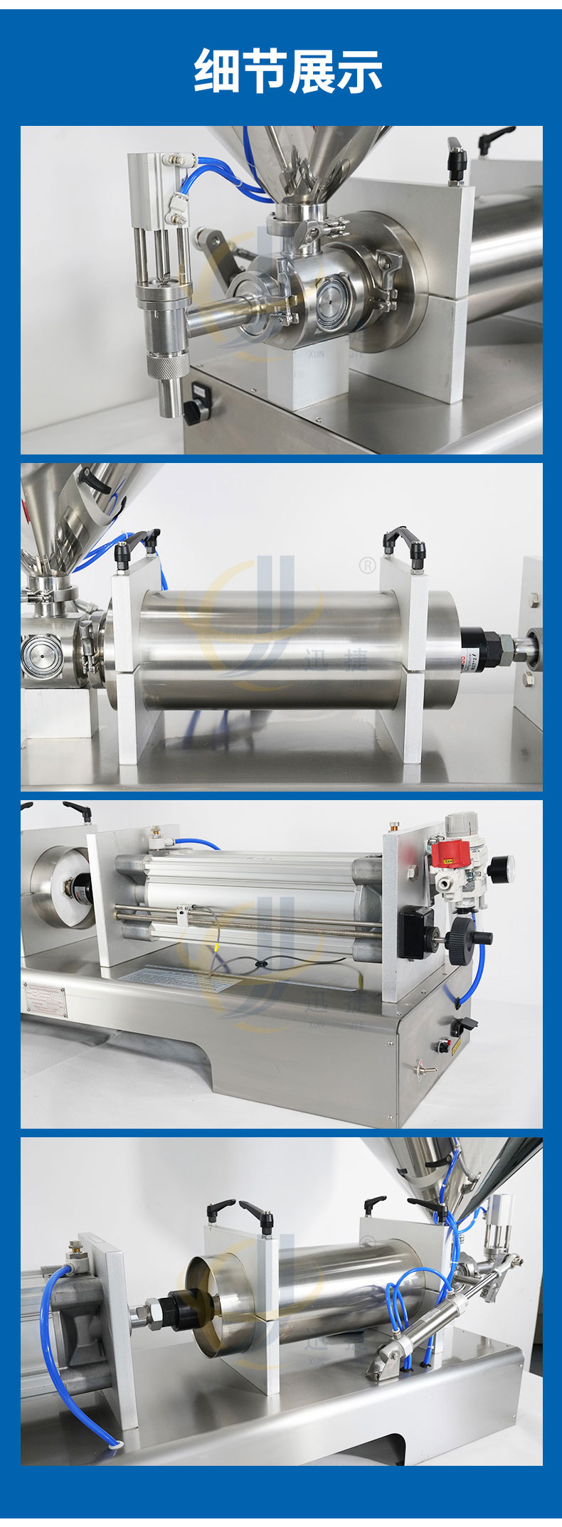 該機為半自動膏體灌裝機,是日化行業(yè)、醫(yī)藥行業(yè)、食品行業(yè)、油墨行業(yè)和涂料行業(yè)的理想灌裝充填設(shè)備,灌裝悶頭采用防滴漏。