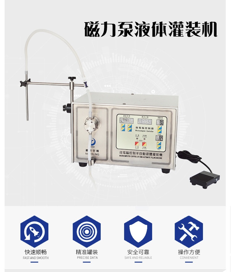 該機(jī)為磁力泵式灌裝機(jī),適用于藥劑、化學(xué)品、油類、化妝品、食品、實驗室用等無顆粒狀液體的灌裝。